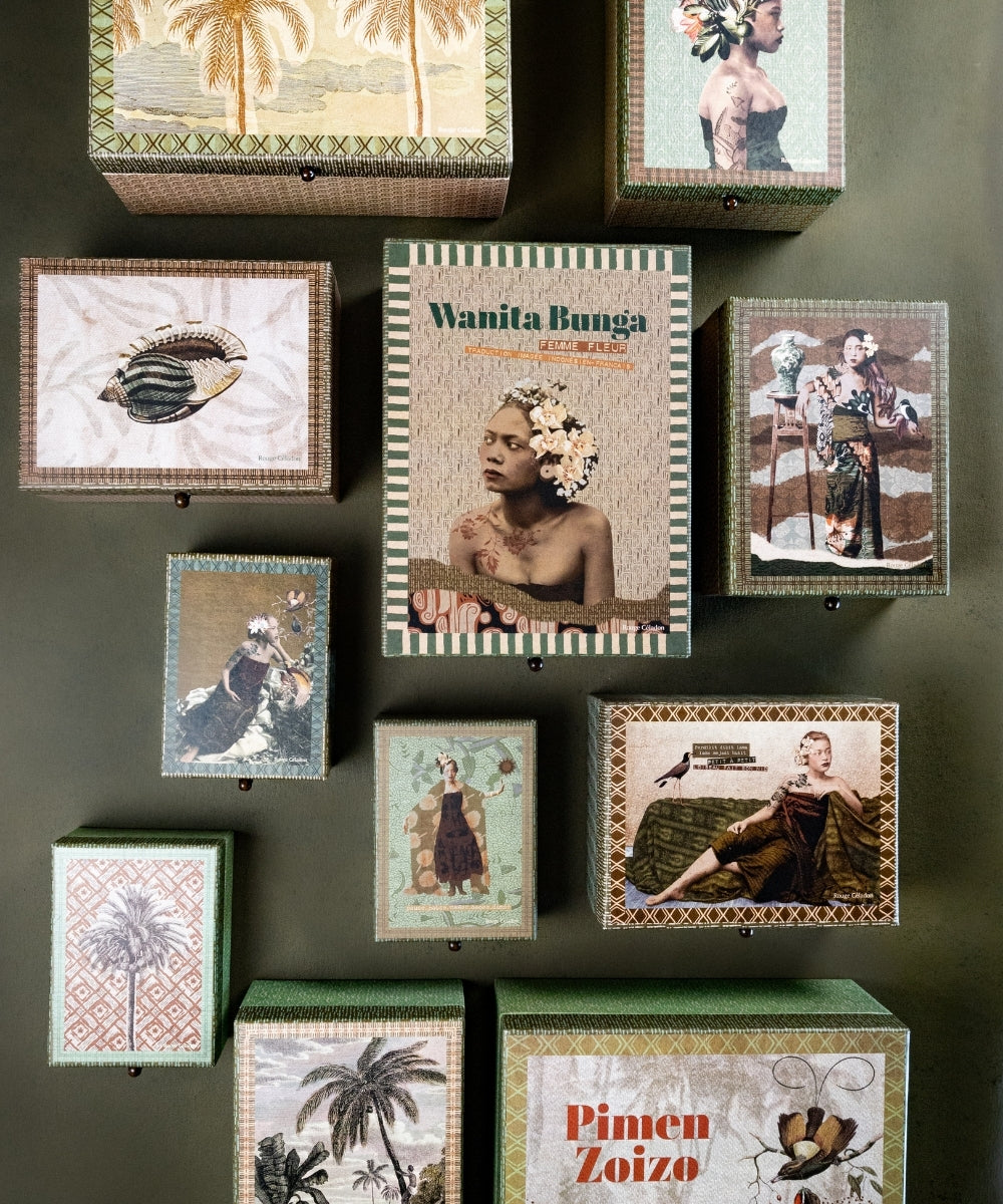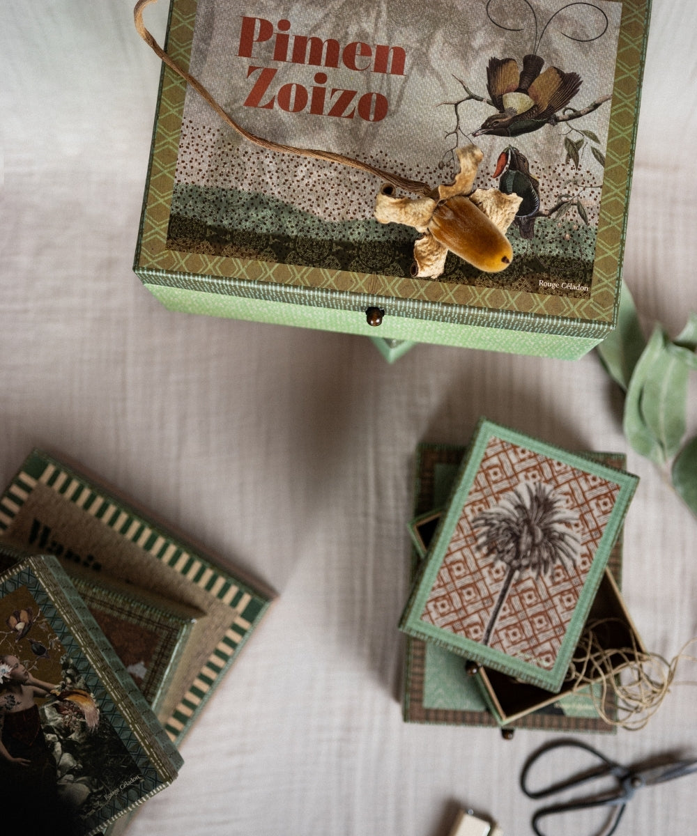 Découvrez nos boîtes décoratives JALAN JALAN, en carton rigide imprimé de motifs exclusifs inspirés du voyage. Chaque coffret dévoile une scène poétique et offre un bel espace pour ranger bijoux, souvenirs ou petits objets. Un accessoire pratique et décoratif, idéal pour organiser son intérieur ou offrir un cadeau élégant et original.