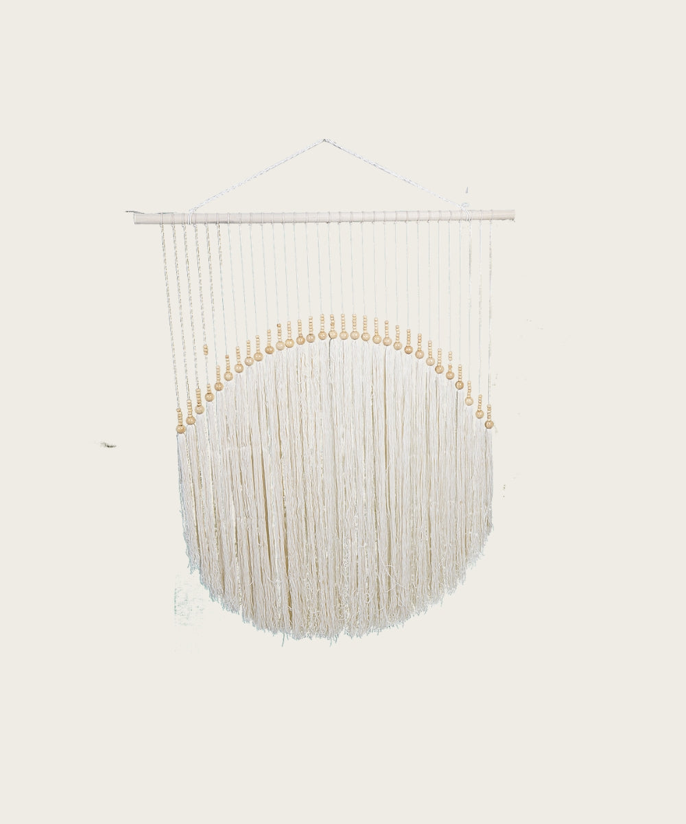 Décoration murale en fil de coton, réalisée à la main dans une élégante forme arrondie.