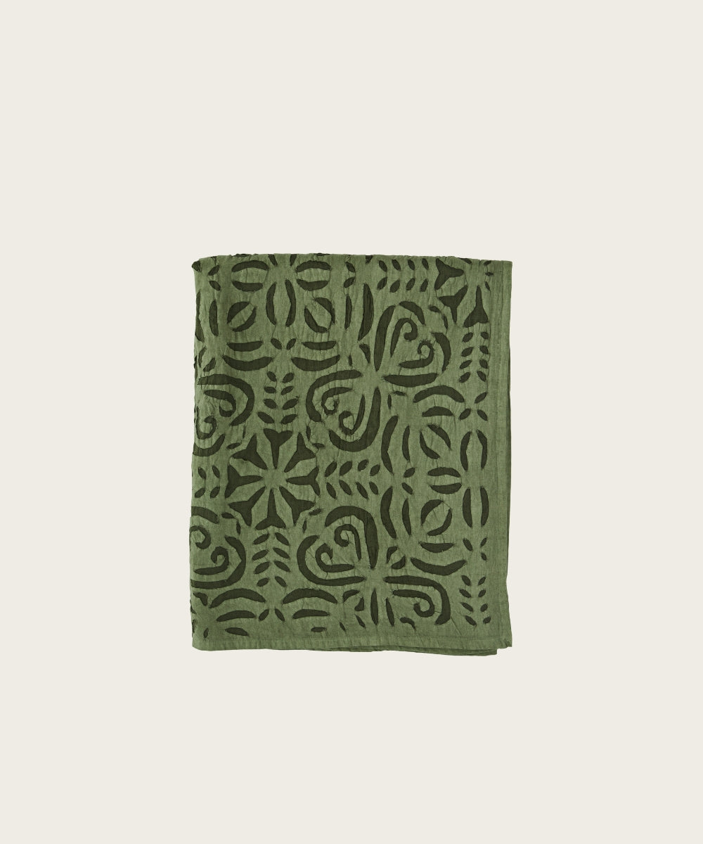 Ce jeté en coton et organza, entièrement réalisé à la main selon la technique du cutwork, révèle un jeu de transparence subtil et des motifs sculptés dans la matière.