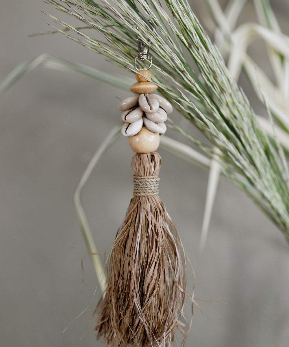 Ce petit porte clé en coquillage et raphia est un accessoire idéal : il agrémentera vos sacs et paniers et trouvera aussi sa place dans la maison pour donner du caractère à votre déco accroché à la clé d'un meuble ou d'une porte. C'est aussi une parfaite idée pour un petit cadeau artisanal et plein de charme !