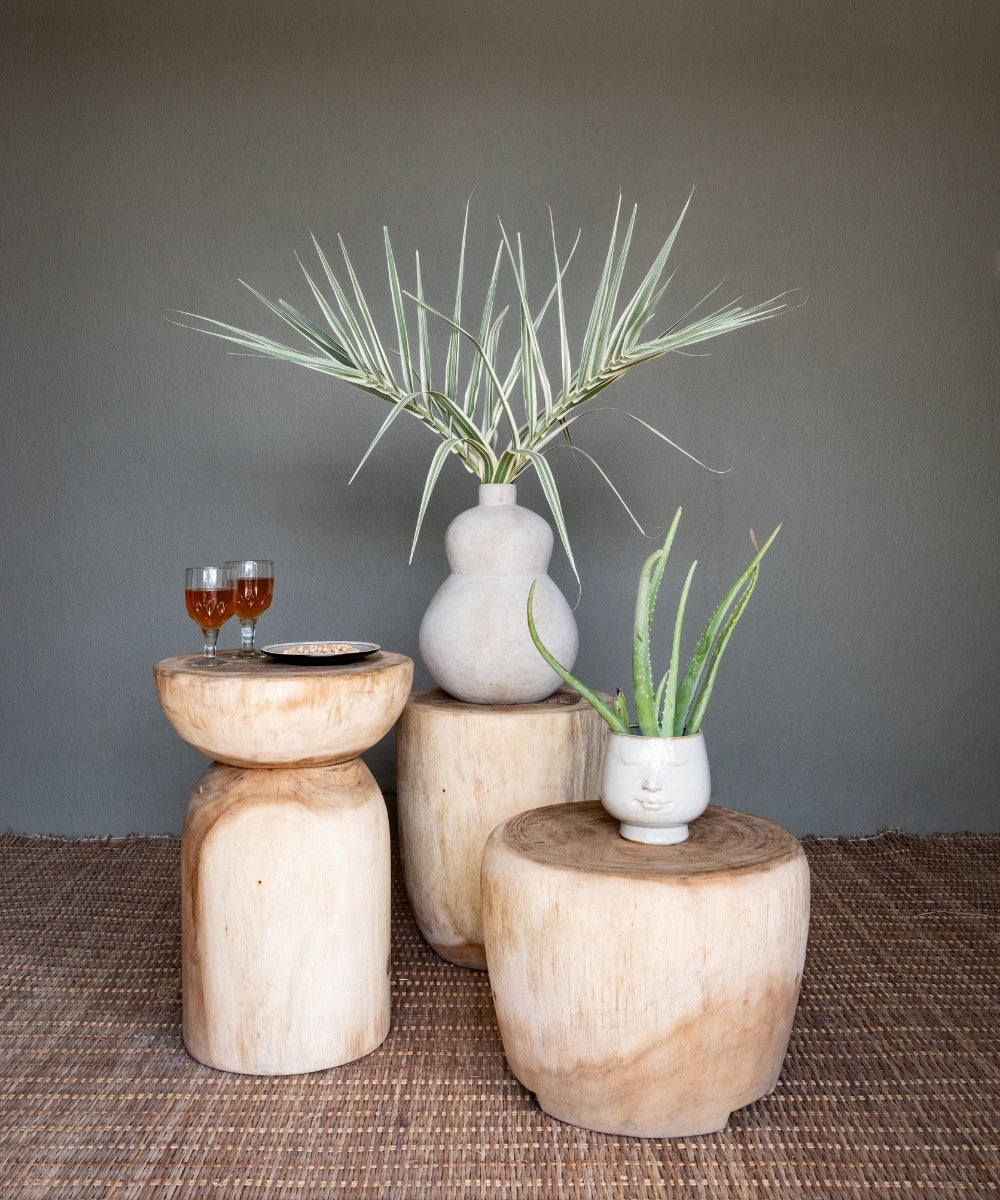 Le suar (aussi appelé “arbre à pluie”) est un bois au veinage clair et nuancé, réputé pour sa solidité et son caractère durable. Chaque pièce est taillée dans la masse, ce qui lui confère une allure unique, organique et pleine de charme.